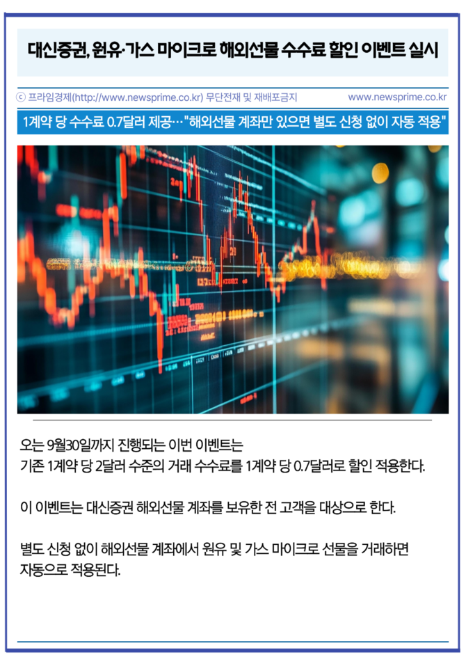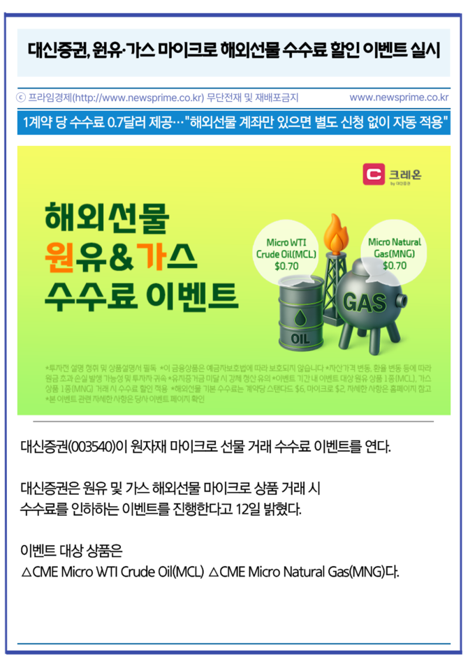 대신증권은 원유 및 가스 해외선물 마이크로 상품 거래 시 수수료를 인하하는 이벤트를 진행한다고 12일 밝혔다.