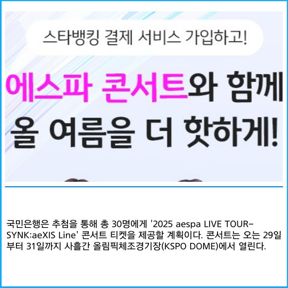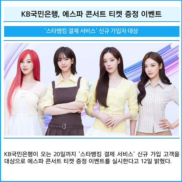 [프라임경제] KB국민은행이 오는 20일까지 '스타뱅킹 결제 서비스' 신규 가입 고객을 대상으로 에스파 콘서트 티켓 증정 이벤트를 실시한다고 12일 밝혔다.