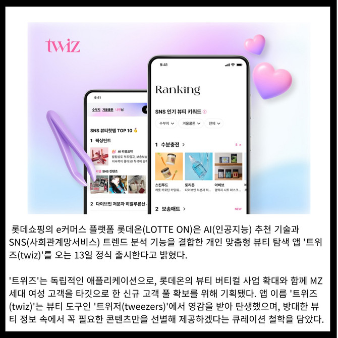 [프라임경제] 롯데쇼핑의 e커머스 플랫폼 롯데온(LOTTE ON)은 AI(인공지능) 추천 기술과 SNS(사회관계망서비스) 트렌드 분석 기능을 결합한 개인 맞춤형 뷰티 탐색 앱 '트위즈(twiz)'를 오는 13일 정식 출시한다고 밝혔다.