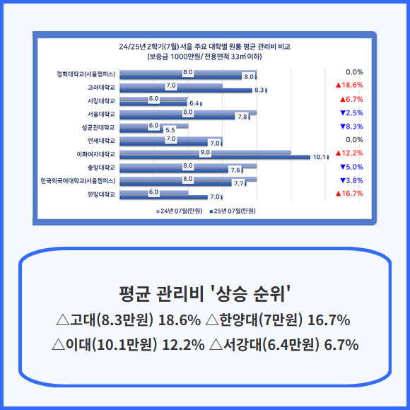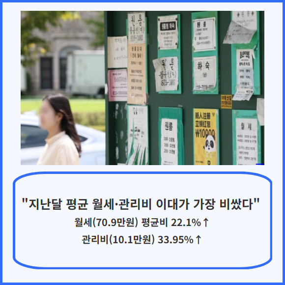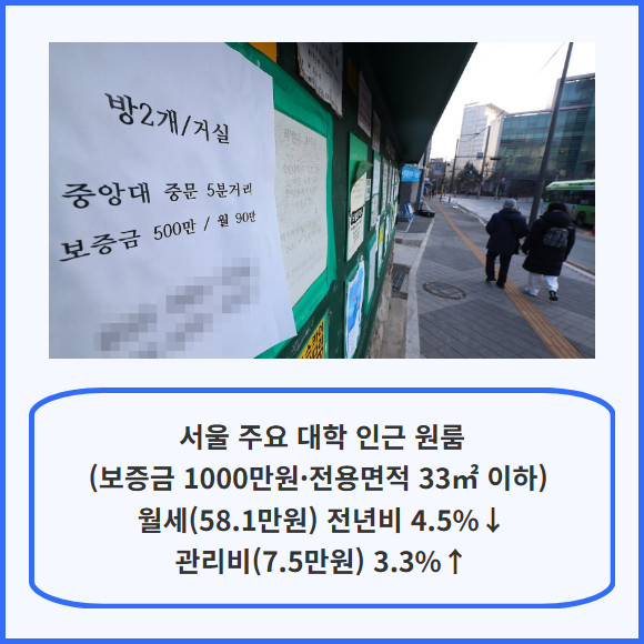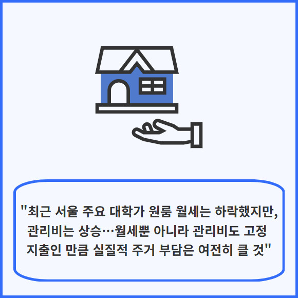 [프라임경제] 서울 주요 대학가 주변 원룸 월세가 작년보다 다소 내려갔지만, 관리비는 오히려 올라 여전히 주거비 부담이 큰 것으로 나타났다.