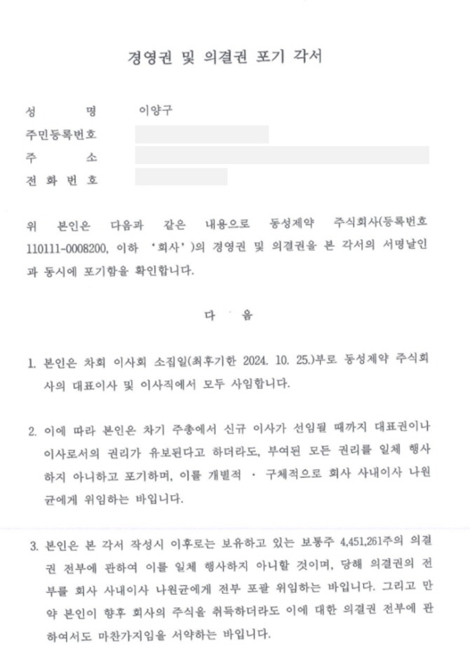 하지만 이 전 회장은 이미 지난해 10월 나 대표와 '의결권 포괄 위임 약정'과 '경영권 및 의결권 포기 각서'를 체결했고, 같은 해 12월에는 나 대표의 모친이자 자신의 누나인 이경희 씨와 '주식 양도 계약서'를 맺은 바 있다.
