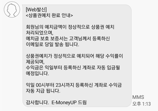이머니업은 피해자들의 불안감을 해소하기 위해 '예치금 보호 보증서'라는 허위 문서를 교부했다. 이 문서는 '월 15~20% 수익 보장'이라는 비현실적인 문구와 함께 공정거래법, 전자상거래법 관련 조항을 무단으로 명시해 법적 효력이 있는 것처럼 교묘하게 위장했다.