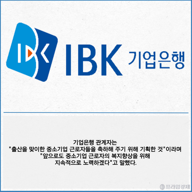 [프라임경제] IBK기업은행(024110)이 중소기업 근로자를 대상으로 '출산축하 바우처'를 제공한다고 12일 밝혔다.