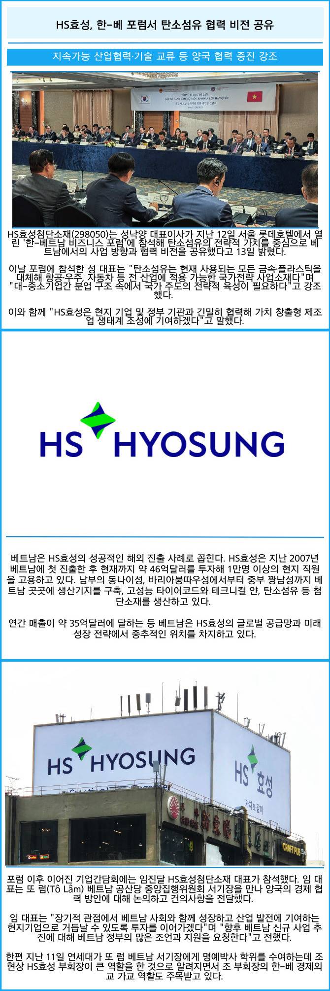 [프라임경제] HS효성첨단소재(298050)는 성낙양 대표이사가 지난 12일 서울 롯데호텔에서 열린 '한-베트남 비즈니스 포럼'에 참석해 탄소섬유의 전략적 가치를 중심으로 베트남에서의 사업 방향과 협력 비전을 공유했다고 13일 밝혔다.