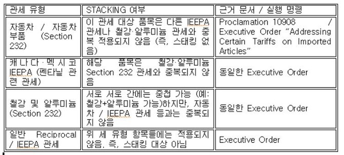 행정명령(EO 14289, 25.4.29.) 및 구리포고문에는 따라 이러한 Stacking(중복과세) 배제를 규정하면서 철강·알루미늄, 구리(반제품 포함)는 중복적용을 배제하여 품목별 관세 50%가 부과되며 자동차 또한 기존 포고문(Proclamation 10908)이 있어 별도의 포고문이나 행정명령(EO)이 있어야만 15% 상호관세가 적용될 수 있다는 점을 명심해야 한다.