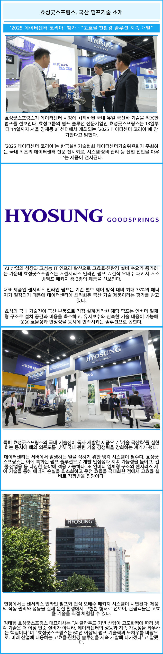 [프라임경제] 효성굿스프링스가 데이터센터 시장에 최적화된 국내 유일 국산화 기술을 적용한 펌프를 선보인다. 효성그룹의 펌프 솔루션 전문기업인 효성굿스프링스는 13일부터 14일까지 서울 양재동 aT센터에서 개최되는 '2025 데이터센터 코리아'에 참가한다고 밝혔다.