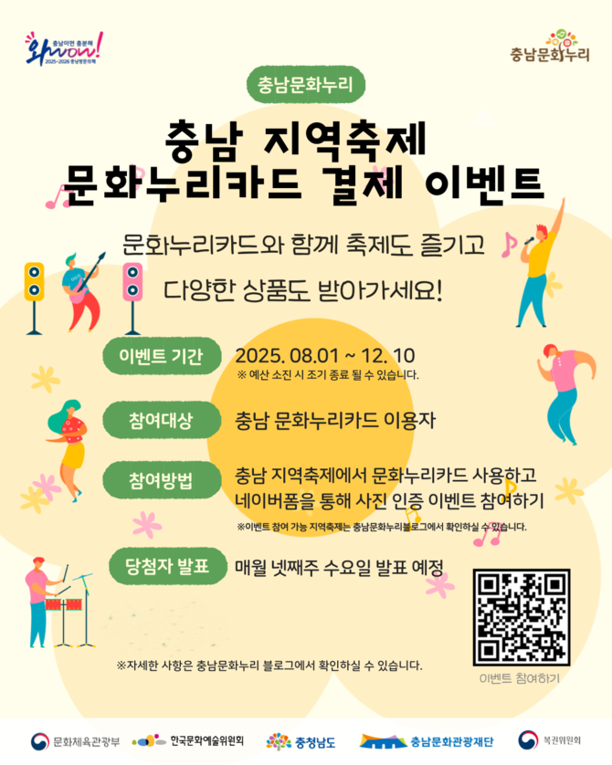 재단 관계자는 "이번 이벤트를 통해 도민들이 보다 쉽게 문화누리카드를 활용하고, 충남 지역 문화·관광·체육 참여 기회를 확대할 수 있을 것"이라고 밝혔다.