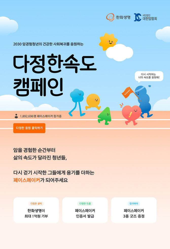 한화생명은 암경험청년들이 각기 다른 속도로 사회에 복귀하는 과정을 존중하고 응원하기 위해 이번 캠페인을 진행한다. 캠페인 참여자는 암경험청년들의 사회복귀를 응원하는 서포터로서 ‘페이스메이커’라 불리게 된다.