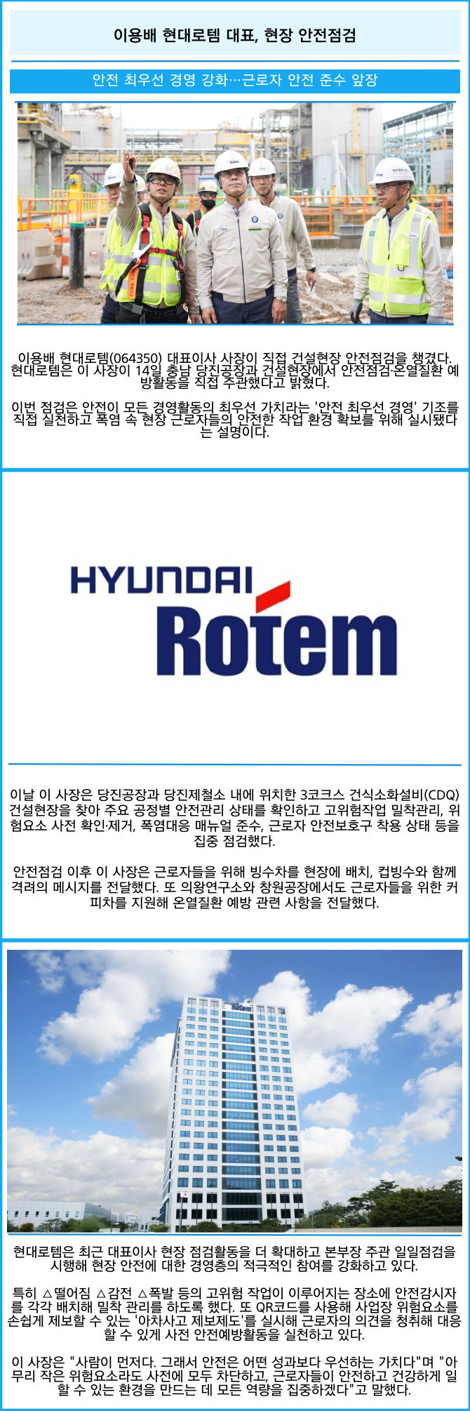 [프라임경제] 이용배 현대로템(064350) 대표이사 사장이 직접 건설현장 안전점검을 챙겼다. 현대로템은 이 사장이 14일 충남 당진공장과 건설현장에서 안전점검·온열질환 예방활동을 직접 주관했다고 밝혔다.