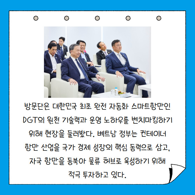 [프라임경제] 동원그룹은 베트남 권력 서열 1위인 또 럼 당서기장이 14일 부산 신항의 동원글로벌터미널부산(DGT)을 방문해 김남정 회장과 환담했다고 밝혔다. 럼 서기장은 지난해 베트남 공산당 중앙위원회에서 만장일치로 추대된 국가 최고 지도자로, 이번 방한은 한·베 양국의 우호 증진과 경제 협력 강화를 위한 차원이다.