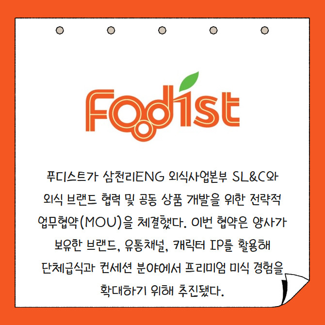 [프라임경제] 푸디스트가 삼천리ENG 외식사업본부 SL&C와 외식 브랜드 협력 및 공동 상품 개발을 위한 전략적 업무협약(MOU)을 체결했다. 이번 협약은 양사가 보유한 브랜드, 유통채널, 캐릭터 IP를 활용해 단체급식과 컨세션 분야에서 프리미엄 미식 경험을 확대하기 위해 추진됐다.