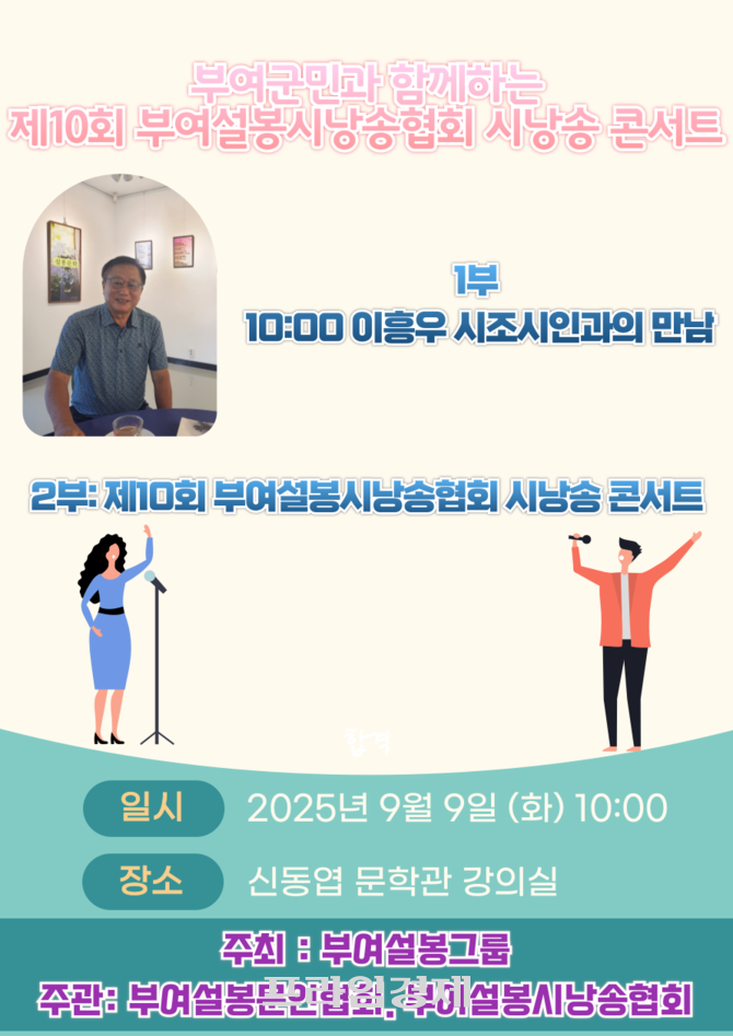 2부에서는 제10회 부여설봉시낭송협회 시낭송 콘서트가 열려, 지역 시낭송가들이 다양한 시를 낭송하며 관객과 감동을 나눌 예정이다. 이번 콘서트는 부여 지역 문학문화 활성화와 군민의 정서 함양을 목표로 하고 있다.