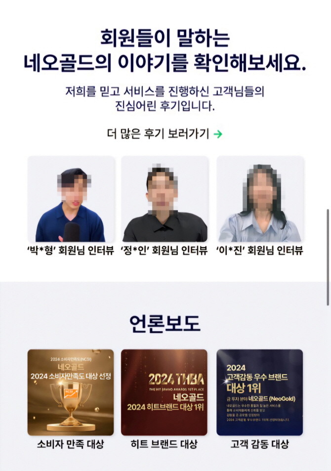 '2025년 K-베스트브랜드 대상 수상', '(주)네오골드, 론칭 2년만 회원 수 5만3천명 돌파'. 폰지사기 업체들을 검색하면 나오는 기사 헤드라인이다.