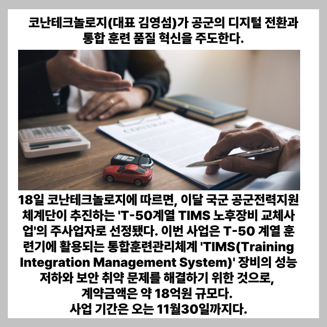 코난테크놀로지는 이달 국군 공군전력지원체계단이 추진하는 'T-50계열 TIMS 노후장비 교체사업'의 주사업자로 선정됐다고 18일 밝혔다.