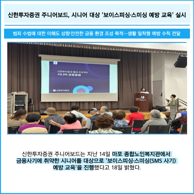 [프라임경제] 신한투자증권 주니어보드는 지난 14일 마포 종합노인복지관에서 금융사기에 취약한 시니어를 대상으로 '보이스피싱·스미싱(SMS 사기) 예방 교육'을 진행했다고 18일 밝혔다.