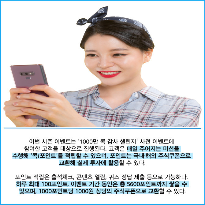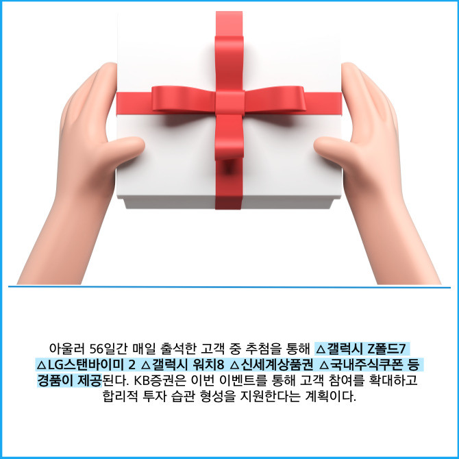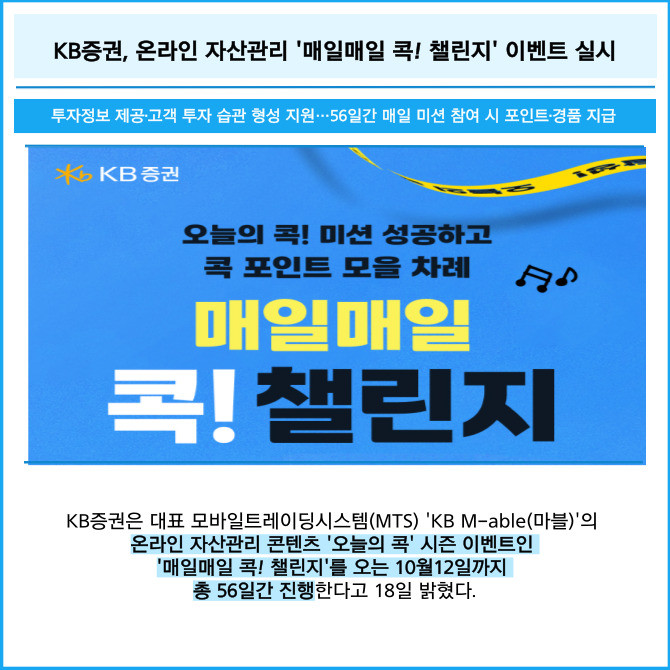 [프라임경제] KB증권은 대표 모바일트레이딩시스템(MTS) 'KB M-able(마블)'의 온라인 자산관리 콘텐츠 '오늘의 콕' 시즌 이벤트인 '매일매일 콕! 챌린지'를 오는 10월12일까지 총 56일간 진행한다고 18일 밝혔다.