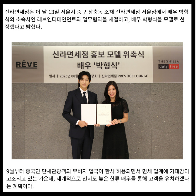 [프라임경제] 신라면세점은 이 달 13일 서울시 중구 장충동 소재 신라면세점 서울점에서 배우 박형식의 소속사인 레브엔터테인먼트와 업무협약을 체결하고, 배우 박형식을 모델로 선정했다고 밝혔다.