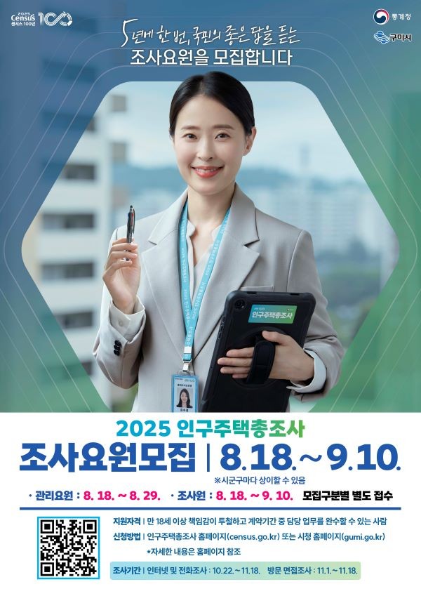 구미시는 오는 11월 전국적으로 시행되는 '2025 인구주택총조사'의 성공적인 수행을 위해 총 250명의 조사요원을 모집한다.