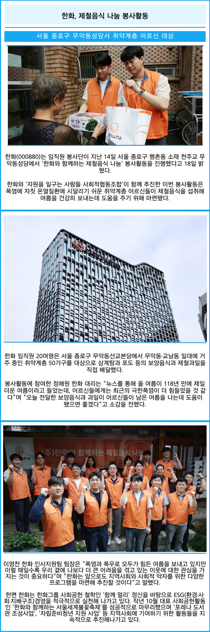 [프라임경제] 한화(000880)는 임직원 봉사단이 지난 14일 서울 종로구 행촌동 소재 천주교 무악동성당에서 '한화와 함께하는 제철음식 나눔' 봉사활동을 진행했다고 18일 밝혔다.