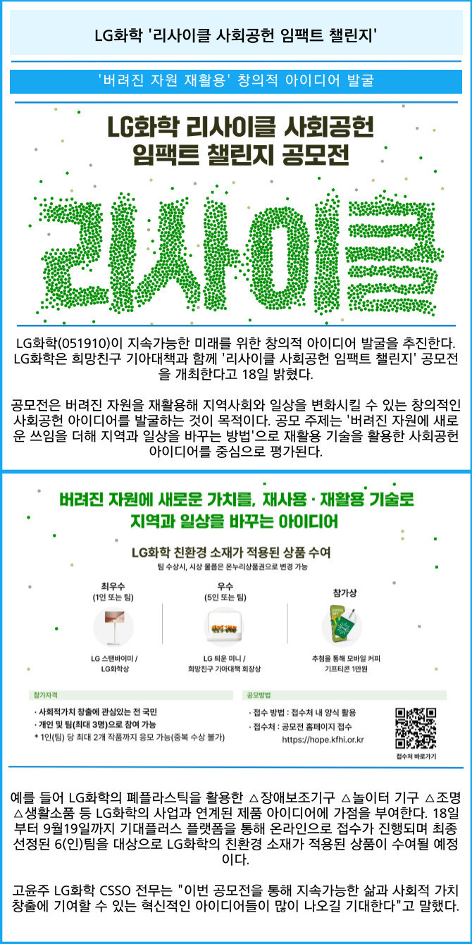 [프라임경제] LG화학(051910)이 지속가능한 미래를 위한 창의적 아이디어 발굴을 추진한다. LG화학은 희망친구 기아대책과 함께 '리사이클 사회공헌 임팩트 챌린지' 공모전을 개최한다고 18일 밝혔다.