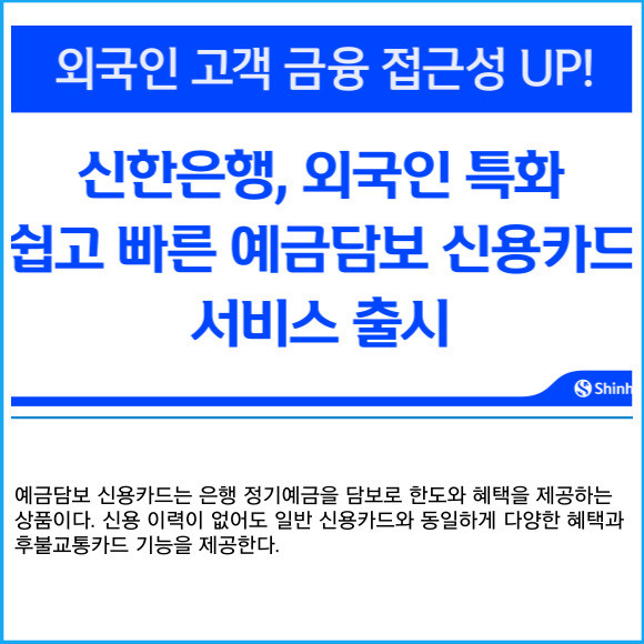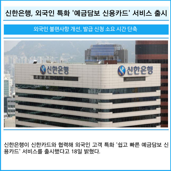 [프라임경제] 신한은행이 신한카드와 협력해 외국인 고객 특화 '쉽고 빠른 예금담보 신용카드' 서비스를 출시했다고 18일 밝혔다.