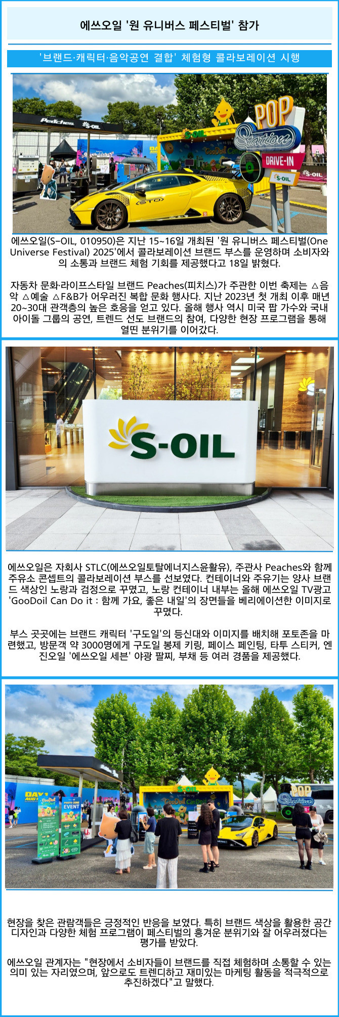 [프라임경제] 에쓰오일(S-OIL, 010950)은 지난 15~16일 개최된 '원 유니버스 페스티벌(One Universe Festival) 2025'에서 콜라보레이션 브랜드 부스를 운영하며 소비자와의 소통과 브랜드 체험 기회를 제공했다고 18일 밝혔다.