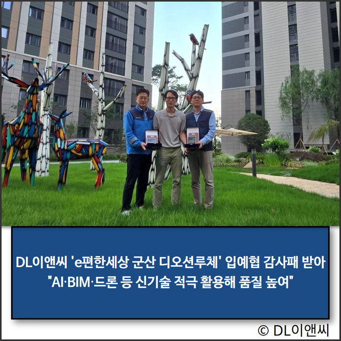 DL이앤씨(375500)가 전북 군산시 구암동 'e편한세상 군산 디오션루체' 입주예정자협의회(이하 입예협)로부터 우수한 시공 품질과 고객만족 실현에 대한 감사패를 전달받았다.