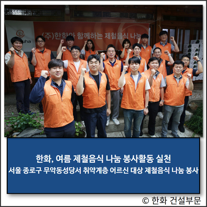 한화와 '자원을 일구는 사람들 사회적협동조합'이 함께 추진한 이번 봉사활동은 폭염에 자칫 온열질환에 시달리기 쉬운 취약계층 어르신들이 제철음식을 섭취해 여름을 건강히 보내는데 도움을 주기 위해 마련됐다.