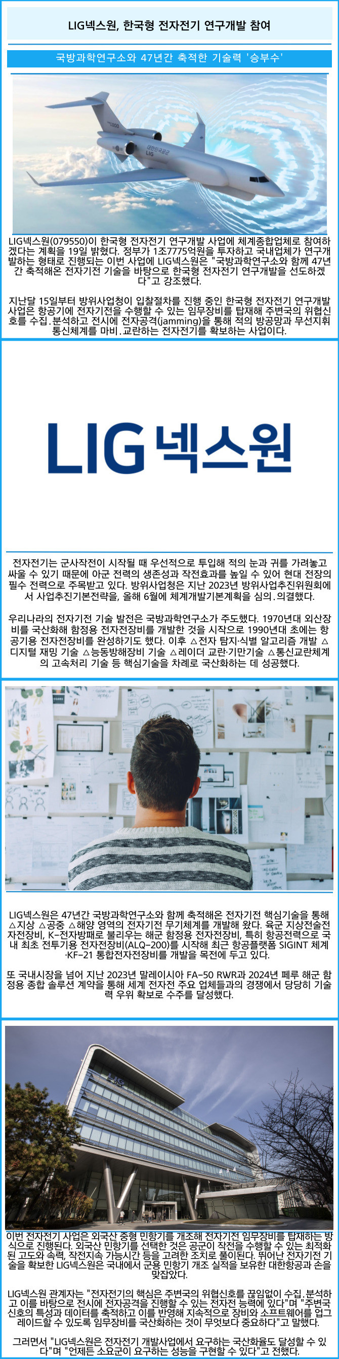 [프라임경제] LIG넥스원(079550)이 한국형 전자전기 연구개발 사업에 체계종합업체로 참여하겠다는 계획을 19일 밝혔다. 정부가 1조7775억원을 투자하고 국내업체가 연구개발하는 형태로 진행되는 이번 사업에 LIG넥스원은 "국방과학연구소와 함께 47년간 축적해온 전자기전 기술을 바탕으로 한국형 전자전기 연구개발을 선도하겠다"고 강조했다.