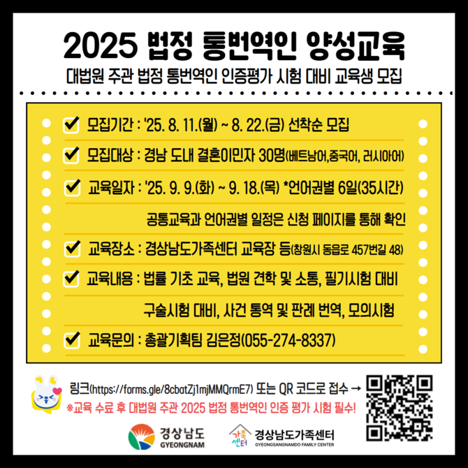 [프라임경제] 경남도와 경상남도가족센터가 8월22일까지 도내 결혼이민자를 대상으로 '2025년 법정 통번역인 양성교육' 참여자 30명을 모집한다.
