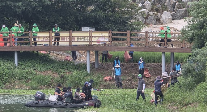충남 서산시 풍전저수지가 자원봉사자의 손길로 집중호우 피해 전의 수려한 경관을 되찾았다.