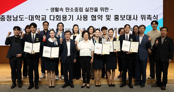 이번 협약은 정부 계획보다 5년 앞당긴 2045 탄소중립 실현과 1회용품 감축을 목표로 마련됐으며, 국립공주대, 남서울대, 세한대, 순천향대, 연암대, 청운대, 혜전대 등 7개 대학이 동참했다.