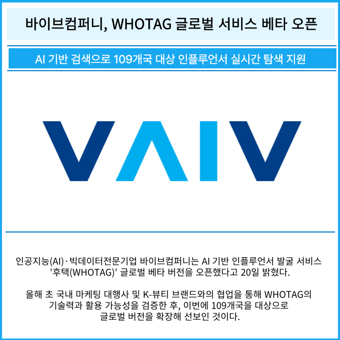 [프라임경제] 인공지능(AI)·빅데이터 전문기업 바이브컴퍼니(301330)는 AI 기반 인플루언서 발굴 서비스 '후택(WHOTAG)' 글로벌 베타 버전을 오픈했다고 20일 밝혔다.