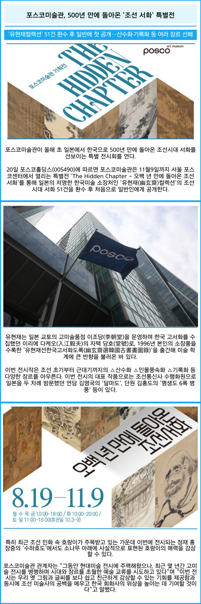 20일 포스코홀딩스(005490)에 따르면 포스코미술관은 11월9일까지 서울 포스코센터에서 열리는 특별전 'The Hidden Chapter - 오백 년 만에 돌아온 조선서화'를 통해 일본의 저명한 한국미술 소장처인 '유현재(幽玄齋)컬렉션'의 조선시대 서화 51건을 환수 후 처음으로 일반인에게 공개한다.