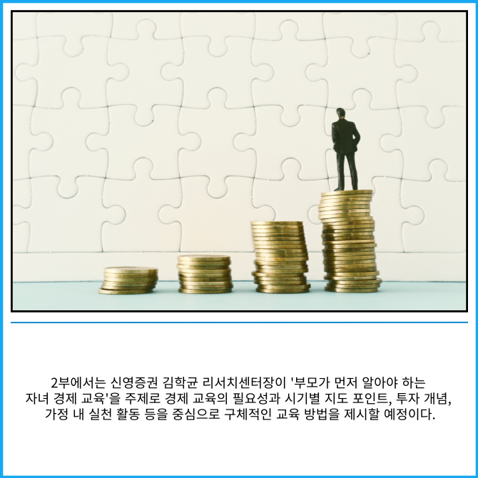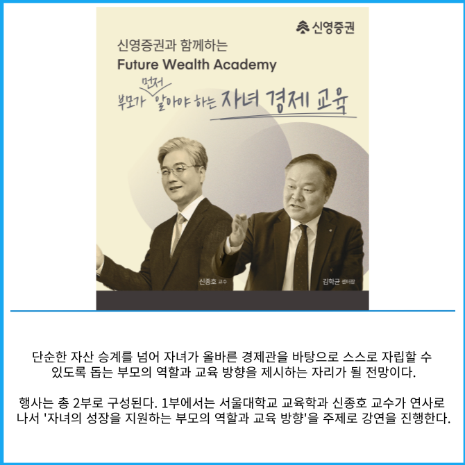 [프라임경제] 신영증권(001720)은 내달 3일 청담 APEX 프라이빗클럽에서 자녀의 올바른 경제관 형성을 위한 교육 프로그램 '퓨처 웰스 아카데미(Future Wealth Academy)'를 개최한다고 20일 밝혔다.