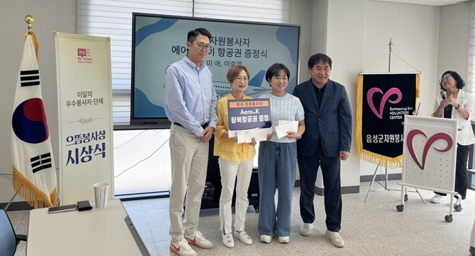 이날 음성군자원봉사센터에서는 청주-나고야, 청주-타이베이 노선 항공권이 각각 증정됐다. 수혜자는 지역 수해 복구, 문화 행사 봉사, 독거노인 급식 봉사 등 다양한 현장에서 헌신한 자원봉사자들로 선정됐다.