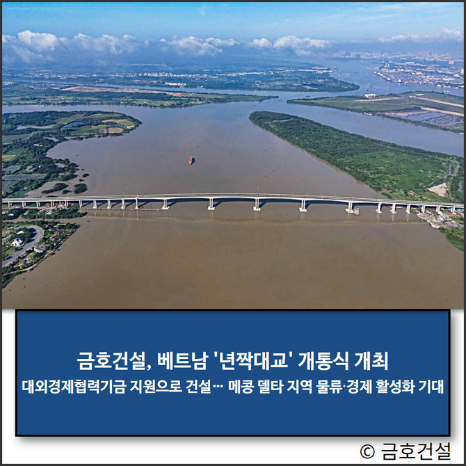 금호건설(002990)이 지난 19일(현지시간) 베트남 호찌민시와 동나이성을 잇는 년짝대교(Nhon Trach Bridge) 개통식을 개최했다고 밝혔다. 이번 개통에 따라 20일 오전 7시부터 교량이 전면 개방됐으며, 이를 통해 동나이와 호찌민을 오가는 구간의 교통 혼잡이 크게 완화될 것으로 기대된다.