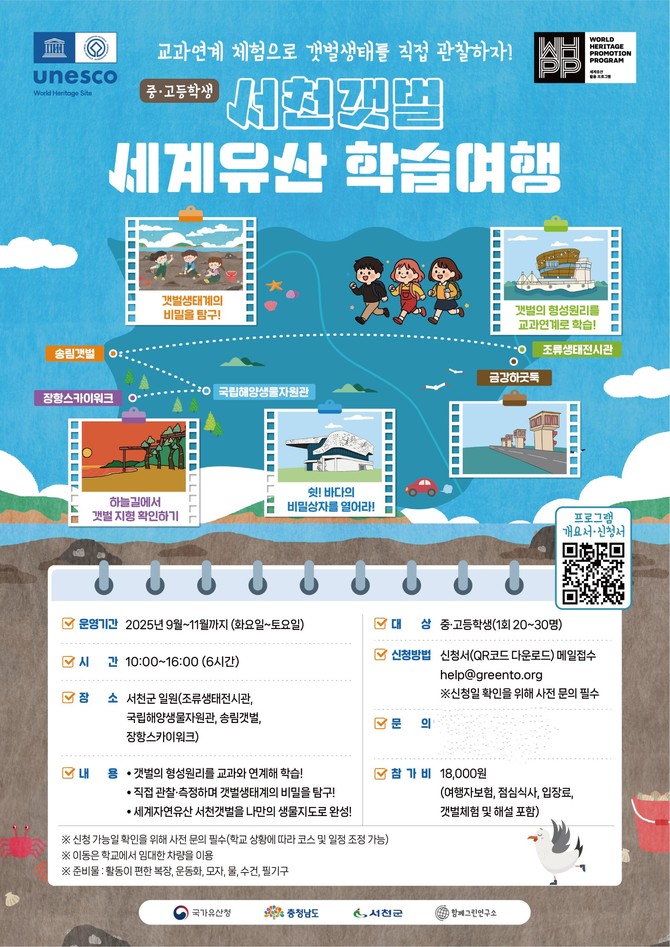 충남 서천군은 오는 9월부터 11월까지 중·고등학생을 대상으로 '서천갯벌 세계유산 학습여행'을 운영한다.