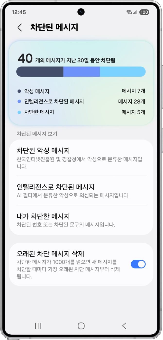 올해 3월 출시된 갤럭시 S25 시리즈에는 '인텔리전스로 차단' 기능이 처음 적용됐다. 월평균 약 500만건의 스팸 신고 데이터를 학습한 AI가 기기 내에서 악성 메시지를 자동 분류·차단하는 방식이다.