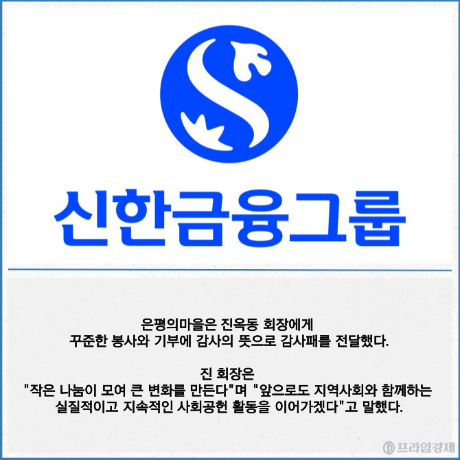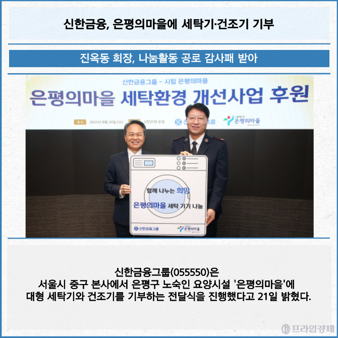 [프라임경제] 신한금융그룹(055550)은 서울시 중구 본사에서 은평구 노숙인 요양시설 '은평의마을'에 대형 세탁기와 건조기를 기부하는 전달식을 진행했다고 21일 밝혔다.