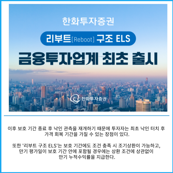 [프라임경제] 한화투자증권은 금융투자업계 최초로 '리부트(Reboot) 구조 주가연계증권(ELS)' 상품을 출시했다고 21일 밝혔다.