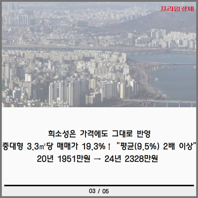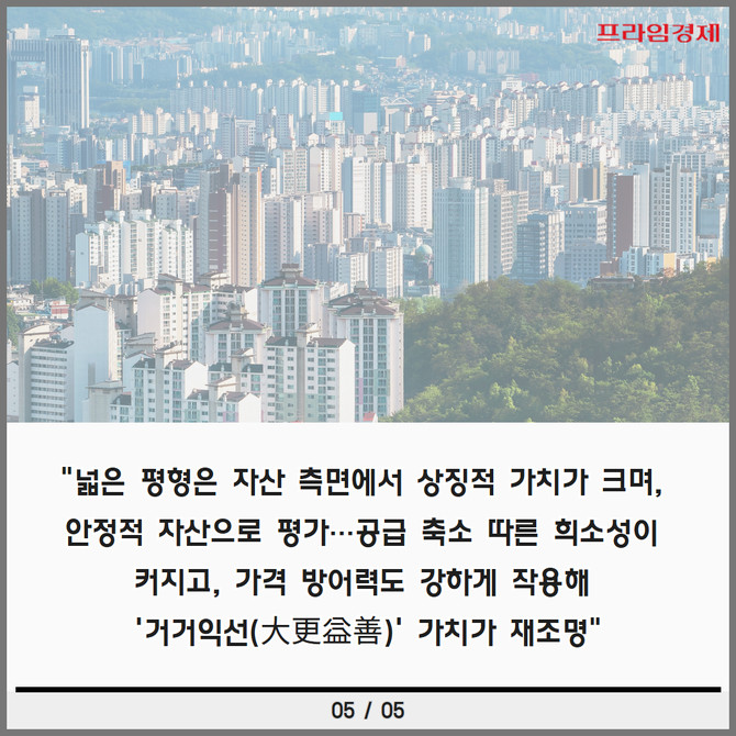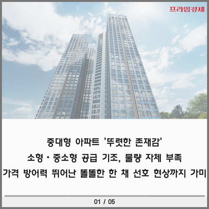 [프라임경제] 올해 부동산 시장에서 중대형 아파트가 뚜렷한 존재감을 드러내고 있다. 한동안 소형·중소형 위주 공급 기조가 이어지며 중대형 물량 자체가 부족한 데다 가격 방어력이 뛰어난 '똘똘한 한 채' 선호 현상까지 더해져 중대형 가치가 더욱 부각되고 있다.