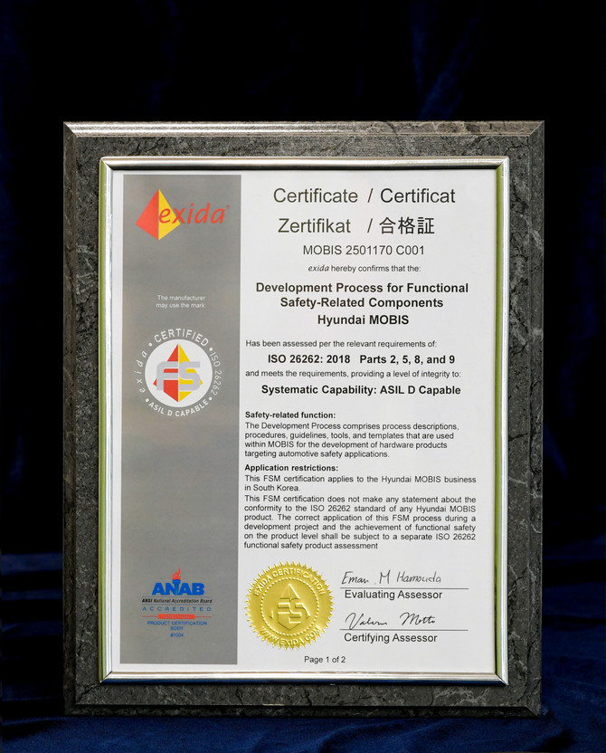현대모비스는 ISO 26262 인증을 위한 차량 안전 무결성 기준(Automotive Safety Integrity Level, ASIL)에서 난이도가 가장 높은 D등급을 받았다. ASIL은 A부터 D까지 총 4단계로 나뉘며, D등급은 99% 이상의 엄격한 신뢰도로 안전사고를 예방할 수 있는 최고 등급이다.