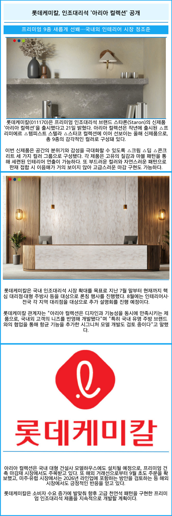 [프라임경제] 롯데케미칼(011170)은 프리미엄 인조대리석 브랜드 스타론(Staron)의 신제품 '아리아 컬렉션'을 출시했다고 21일 밝혔다. 아리아 컬렉션은 작년에 출시된 △프리미에르 △템피스트 스텔라 △스타코 컬렉션에 이어 선보이는 올해 신제품으로, 총 9종의 감각적인 컬러로 구성돼 있다.