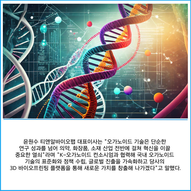 [프라임경제] 3D 바이오프린팅 기반 재생의료 기술 선도기업 티앤알바이오팹(246710)은 최근 서울 웨스틴조선호텔에서 개최된 'K-오가노이드 컨소시엄' 출범식에 참여했으며, 윤원수 대표이사가 컨소시엄의 초대 이사 14인 중 한 명으로 선임됐다고 21일 밝혔다.