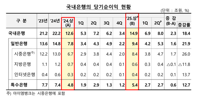 금융감독원(이하 금감원)이 21일 발표한 '2025년 상반기 국내은행 영업실적(잠정)'에 따르면 올해 상반기 국내은행의 당기순이익은 14조9000억원으로 전년 동기(12조6000억원) 대비 2조3000억원(18.4%) 늘었다. 반기 기준 역대 최대 실적이다.