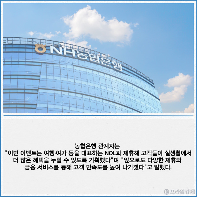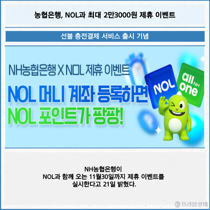[프라임경제] NH농협은행이 NOL과 함께 오는 11월30일까지 제휴 이벤트를 실시한다고 21일 밝혔다.