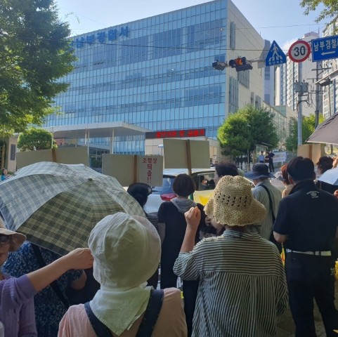 감만1구역재개발조합 비상대책위원회(이하 감만1 비대위)측은 지난 20일 오후 4시 부산 남부경찰서 앞에서 조합원 150여 명이 참여 집회시위를 열었다. 주로 나이 지긋한 어르신들과 주부들이 많았는데도 불구하고 섭씨 30도 중반을 넘나드는 무더위 속에 두 시간여 진행됐다.