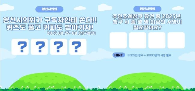 참여 방법은 영천시의회 유튜브 채널을 구독한 뒤 인증샷과 퀴즈 정답을 네이버폼에 제출하면 되며, 응모자 중 60명을 추첨해 음료 기프티콘을 제공한다.