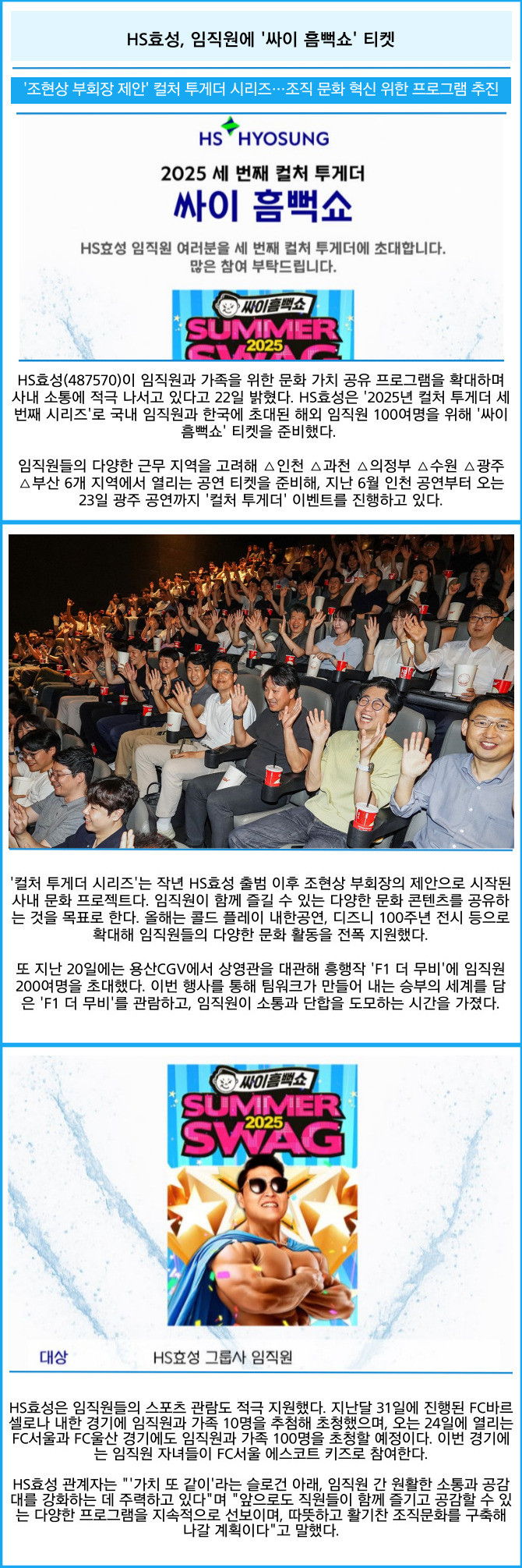 [프라임경제] HS효성(487570)이 임직원과 가족을 위한 문화 가치 공유 프로그램을 확대하며 사내 소통에 적극 나서고 있다고 22일 밝혔다. HS효성은 '2025년 컬처 투게더 세 번째 시리즈'로 국내 임직원과 한국에 초대된 해외 임직원 100여명을 위해 '싸이 흠뻑쇼' 티켓을 준비했다.